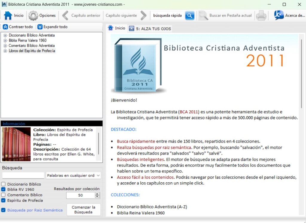 Dada la escasa variedad de herramientas de estudio que incluyen los libros del Espíritu de Profecía, y los tomos del Comentario Bíblico Adventista, el equipo de desarrollo de jovenes-cristianos.com ha creado una potente herramienta de búsqueda, estudio e investigación, que te permitirá tener en una sola aplicación más de 150 libros repartidos en 4 colecciones.
