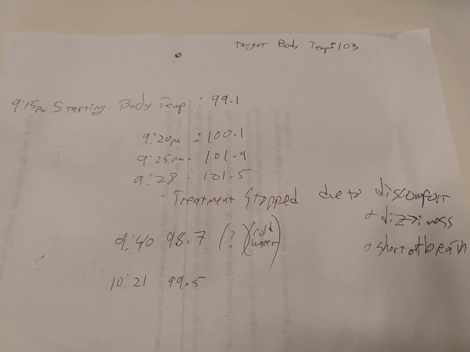 Mi foto en la cama fue la de la última fase del tratamiento. Daniel era mi médico-enfermero en este momento, monitoreaba mi temperatura como parte del tratamiento (segunda foto). La tercera foto era yo ayer por la mañana jugando a la pelota después del baño para la fiebre el jueves (9 abril) por la noche. Volví a la normalidad el viernes (10 abril) por la mañana, sin dolor ni un poquito. Lista para volver al trabajo!
