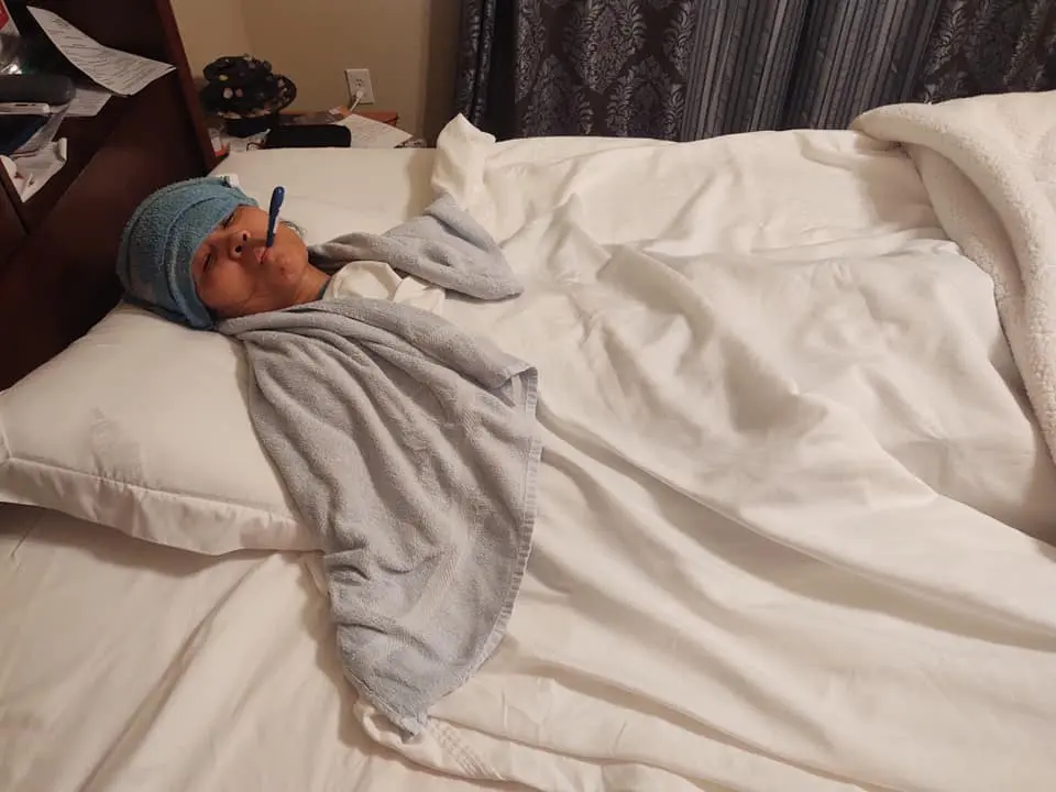A la mañana siguiente, todavía con fiebre pero baja, y dolor corporal. Más tarde en la tarde, decidí informar esto a mis gerentes. Estaba preparada para el Test el 9 de abril, jueves a las 11 a.m. El jueves todavía tenía fiebre con dolor corporal, todavía no tenía tos con secreción nasal leve y un poco de saliva amarillenta. Seguía haciendo compresas frías y, por supuesto, hidratación, agua con vitamina C, frutas, verduras, creyendo que la fiebre bajaría naturalmente pero en vano. El jueves por la noche recordamos y decidimos hacer un Fever Bath (baño para la fiebre). Mi esposo y yo recibimos un entrenamiento médico misionero para esto en Wellness Secrets en Decatur, AR en 2013.