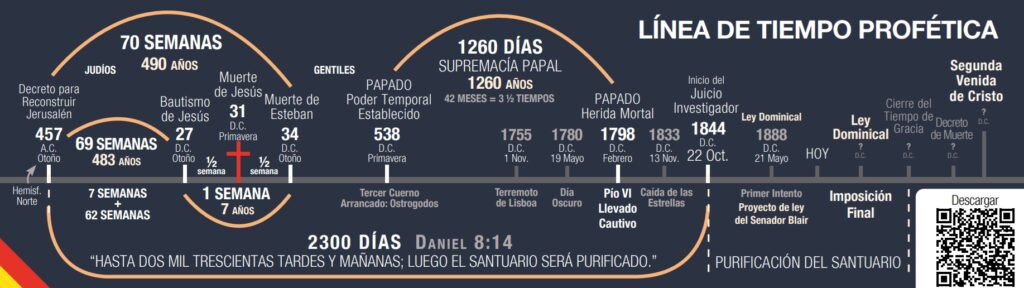 Este diagrama traza eventos clave desde el decreto para reconstruir Jerusalén (457 a.C.) hasta nuestros días. Refleja la teología adventista del séptimo día sobre el santuario celestial, el juicio investigador y los eventos finales de la historia humana, basándose en la interpretación historicista de la profecía bíblica.